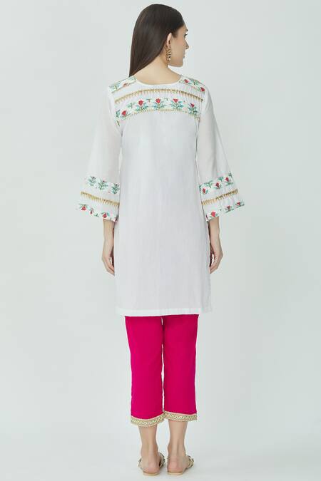 White panelled kurta with floral printed motifs & lace trims. Comes with pink straight pants & pink embellished dupatta.