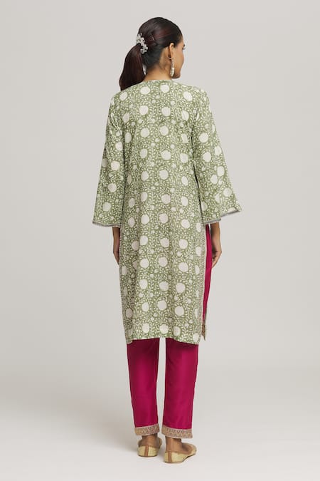 Green Cotton, Chiffon Embroidery, Pearls, Zari, Sequins Zardozi Kurta Pant Set