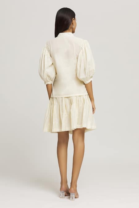 Cream cotton top featuring tonal floral lace embroidery on the placket. Paired with a skirt adorned with golden lines in a stripe pattern.