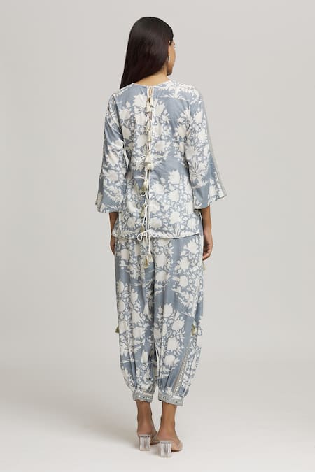 Grey floral printed tunic featuring a floral embroidered yoke and three quarter sleeves. Paired with matching floral print pajama pants with an attached inner lining.