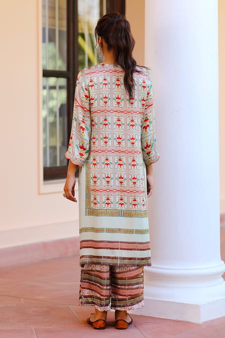 Multicolored kurta with abstract print, Swarovski hand embroidery & round neck. Paired with printed palazzo & striped dupatta.