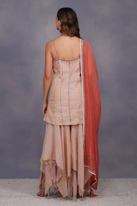 Clay rose spaghetti tissue kurta, adorned with multicoloured sequins work. Paired with a rustic style asymmetrical gharara and a contrasting chanderi dupatta in sequins work.