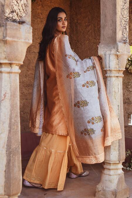 Peach Kurta And Dupatta- Chanderi, Sharara- Cotton Gota Round Set With