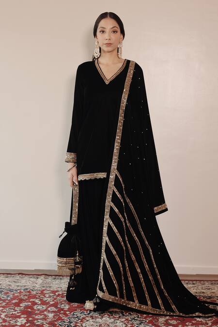 Black kurta featuring a V neck, full sleeves, and scallop borders. Paired with a matching sharara and dupatta showcasing intricate embroidery and pipe work.