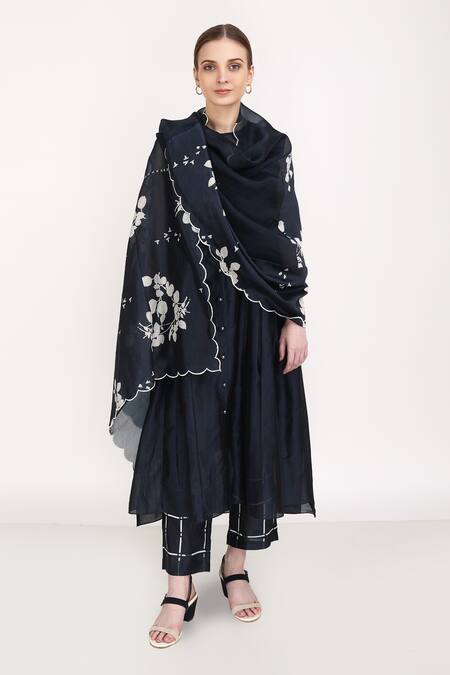 Indigo kurta with side gathered detailing. Paired with checkered pant & floral printed dupatta.