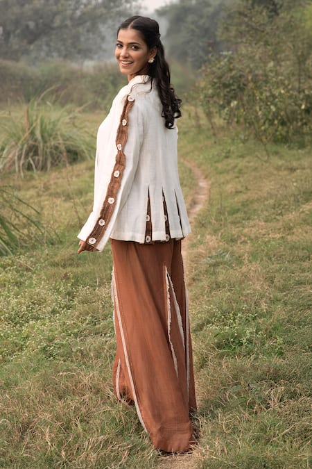 Ivory jacket tunic featuring intricate hand-embroidered motifs and floral detailing along the sleeves. Paired with mocha brown wide-legged trousers accented by ivory panels and kantha stitch.