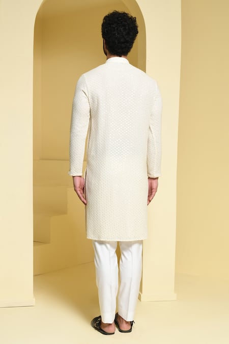 Ivory kurta featuring full sleeves, band collar, and all-over sequin embroidery. Paired with matching pants for a complete look.