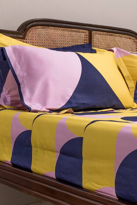 Pop yellow cotton bedcover with sateen finish & all over contrast scallop pattern. Comes with matching monochrome set of 4 pillow cases.