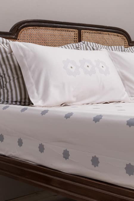Ether blue cotton rectangle-shaped bedsheet with geometric print. Comes with 2 geometric printed pillow cases & 2 striped print pillow cases.