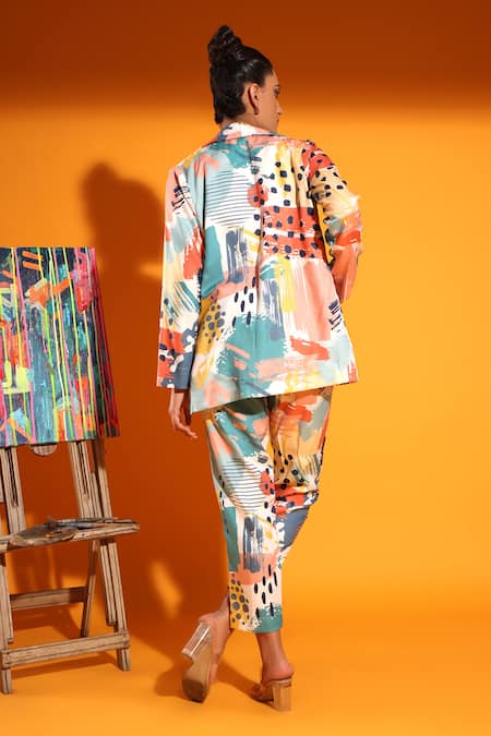 Multi Color Tencel Collared Picassos Dream Hand Painted Jacket Pant Set