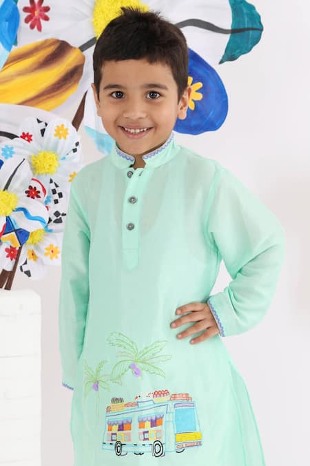 Mint green kurta featuring bus motif embroidery crafted in silk. Paired with a matching pyjama.