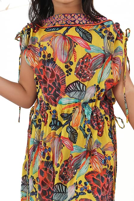Yellow kurti featuring a vibrant floral print with gathered sleeves and side tie-ups. Paired with a printed flared palazzo to complete the look.