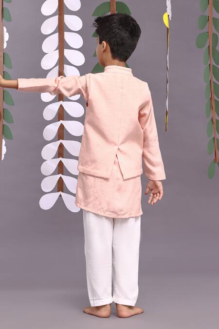 Pink bundi featuring jungle animal motif embroidery with a stand collar. Paired with a kurta and pyjama made from Bamberg silk.