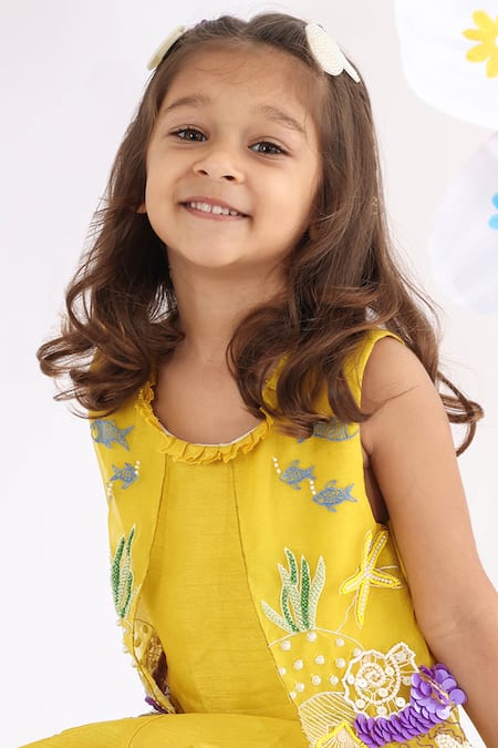 Yellow Silk, Organza, Cotton Embroidery Threadwork Top And Pant Set
