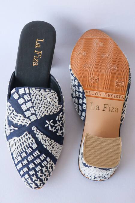 Blue fabric heels featuring closed shoe pattern with thread and bead work