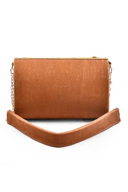 Gold and brown clutch bag featuring stone, bead, cutdana, and crystal embellishments. Comes with a hand embroidered detachable belt.