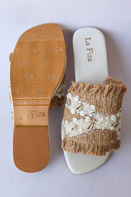 Brown sliders featuring embellished strap with jute braids, bead, and shell work