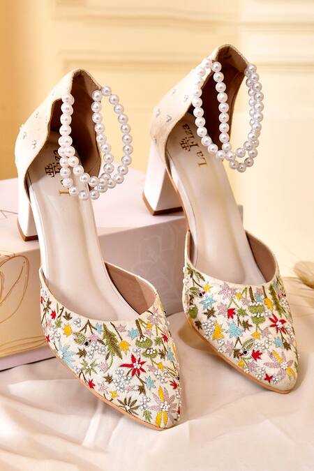 Buy_LA Fiza_White Pearls, Embroidery Strap Block Heels_Online_at_Aza_Fashions