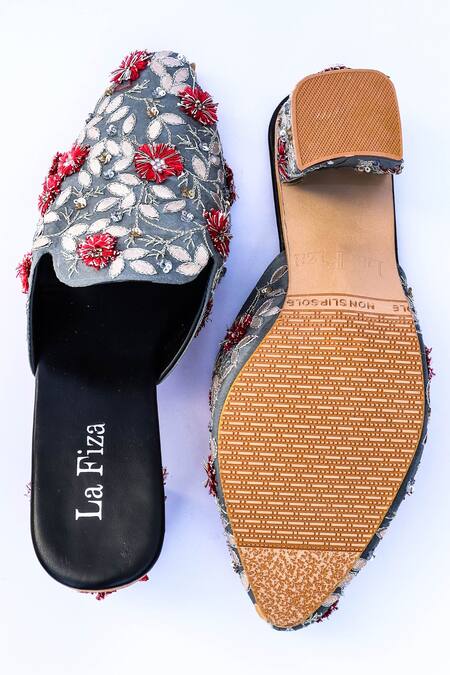 Buy_LA Fiza_Grey Embroidery Hala Pointed Toe Block Heels_Online_at_Aza_Fashions