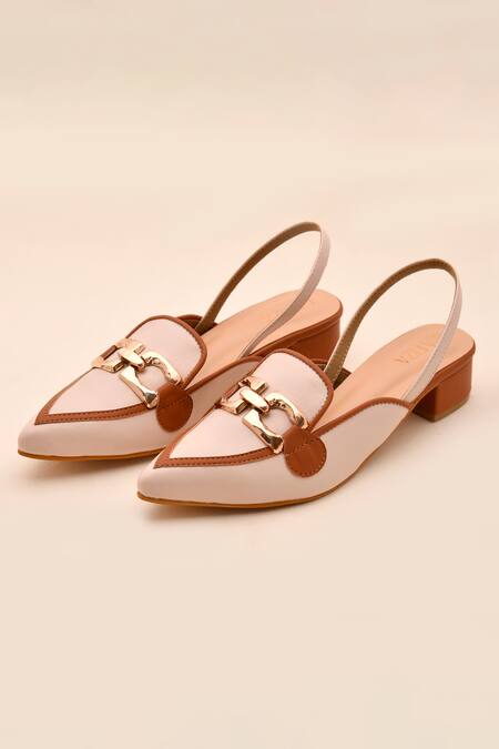 Ivory pointed toe block heel mules featuring a chic design with a gold-tone buckle embellishment