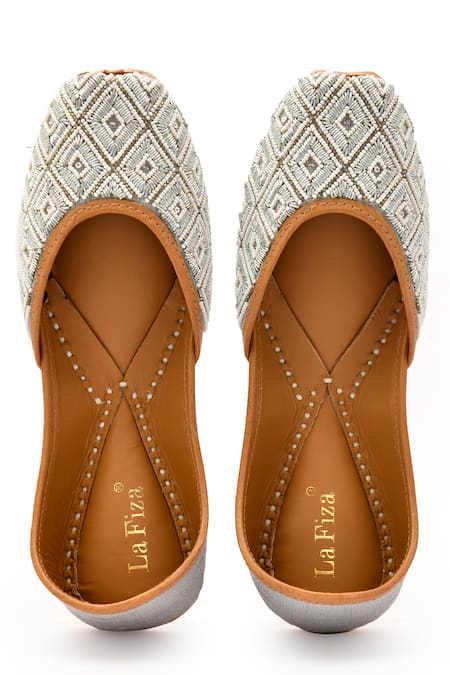 Silver juttis featuring intricate pearl and cutdana embroidery