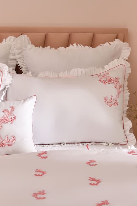 White king size bedsheet in a cotton base with pink placement embroidered baroque motif. Comes with 2 matching pillow covers.