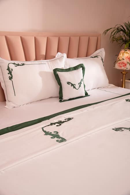 White, green king size duvet cover with thread border placement embroidery in paisley pattern. Comes with a rectangle shaped pillow cover.