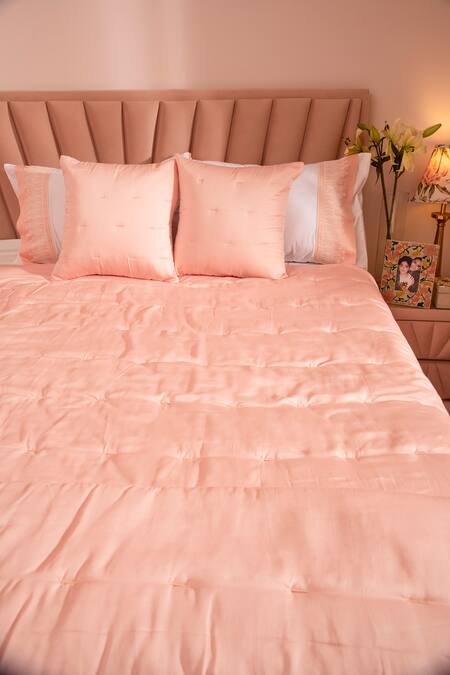 Peach king size bedspread with quilted pattern. Comes with 2 rectangle shaped cushion cover.