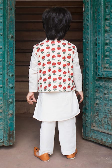Red & white bundi featuring Mogra Gurhal handblock print. Paired with a matching kurta and pant made from Indian cotton.
