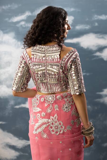 Pink blouse featuring intricate hand embroidery with silver metallic beads and varied sequins