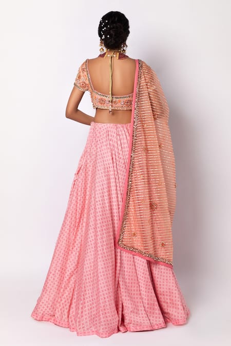 Roseate pink lehenga featuring a geometric print with a relaxed fit. Paired with a hand embroidered blouse adorned with multi-colored stones, cutdana, and crystal work, along with a matching organza dupatta.