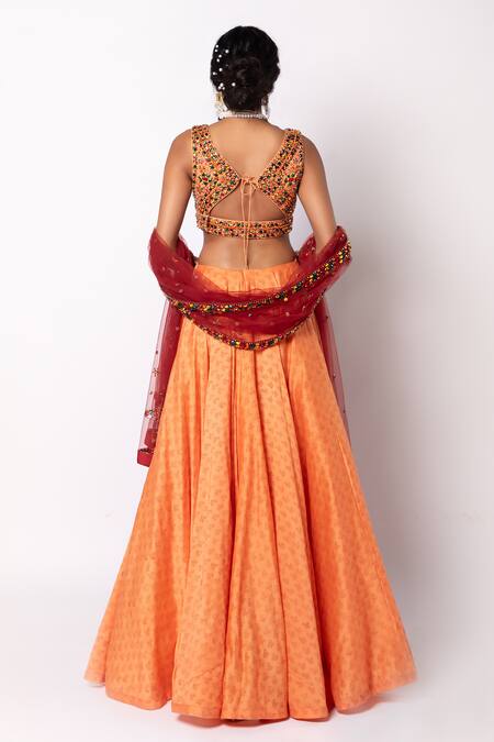 Orange 60 Gm Chanderi Silk Lehenga And Blouse Block & Hand Embroidered Set