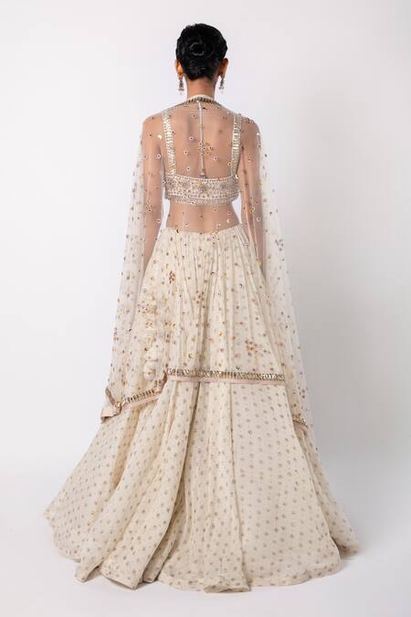Ivory flared pleated lehenga crafted in 60 gm Chanderi silk with attached cancan. Paired with a sleeveless padded embroidered blouse and tulle dupatta.