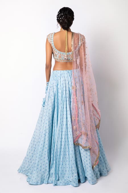 Blue Lehenga And Blouse 60 Gm Chanderi Silk Embroidered Bead Block Print Set