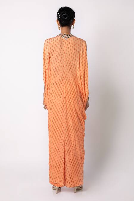Melon orange geometric print kaftan featuring a hand embroidered placket. Paired with a straight pant in cotton silk fabric.