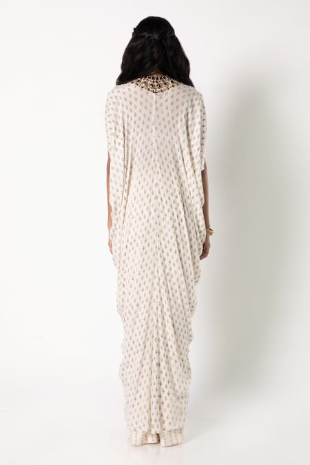 Ivory bead embroidered kaftan featuring a V neck and asymmetric sleeves. Paired with a matching pant in cotton silk.