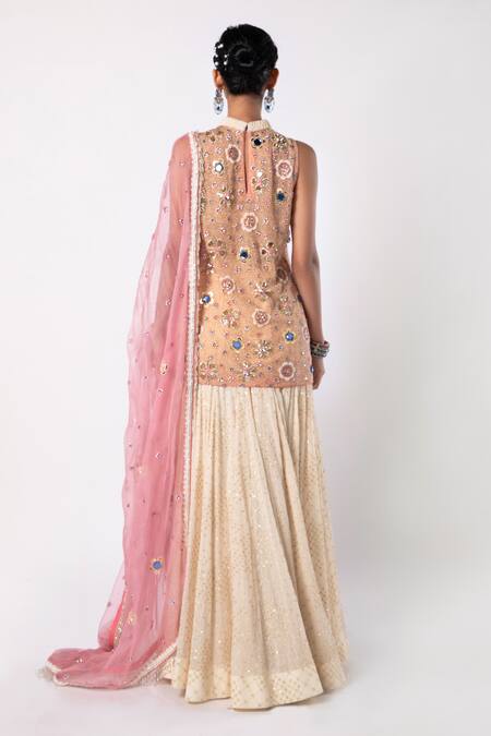 Pink kurta featuring high neck and sleeveless design with all over floral hand embroidery in crystals, stones, and cutdana. Paired with a hand embroidered sharara and an organza silk dupatta.