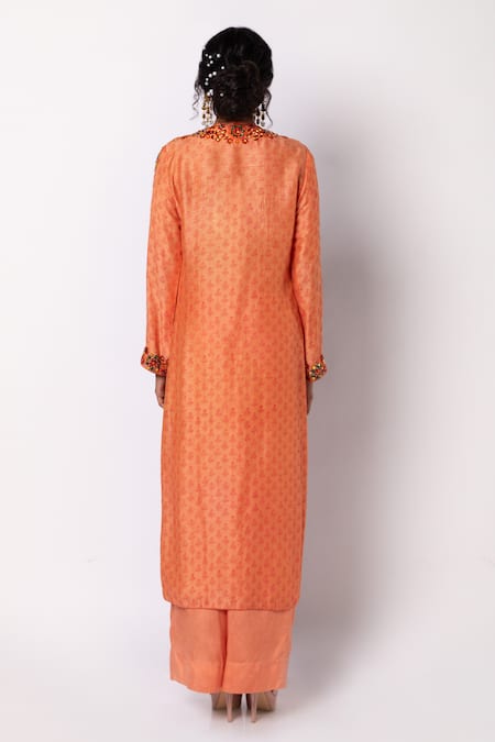 Melon orange kurta featuring all over geometric print, highlighted with hand embroidered placket and full sleeves adorned with multi-colored stones, crystals, and cutdana. Paired with straight cotton silk pant.