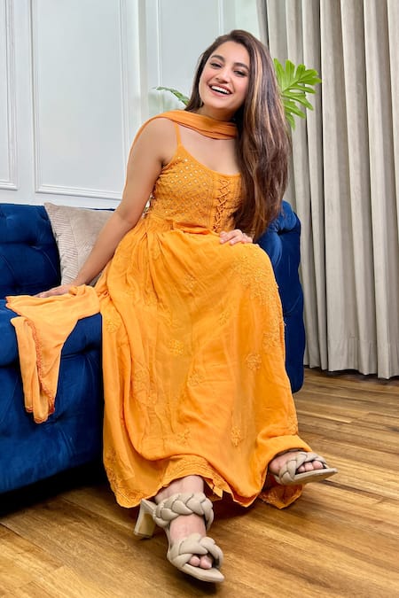 Yellow Chiffon, Georgette Chikankari, Mukaish Scoop Neck Anarkali Set