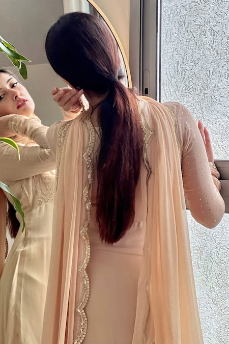 Beige georgette anarkali featuring hand embroidered chikankari work and mukaish detailing. Paired with fitted pants and a chiffon dupatta adorned with sequin embroidered scallop cut work borders.
