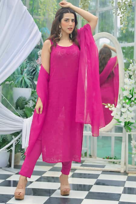Cosmos pink kurta featuring intricate chikankari embroidery in floral patterns. Paired with ankle fit pant and a sheer dupatta.