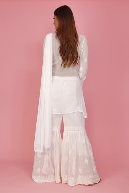 Ivory short hem kurta in georgette base fabric, with chikankari embroidery in resham threads & bell sleeves. Paired with embroidered sharara & soft chiffon dupatta.