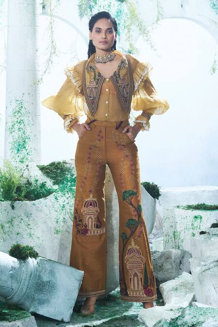 Mustard yellow shirt featuring a pointed collar with intricate applique, zari, aari, and zardozi embroidery. Paired with a padded bralette and matching pant with decorative elements.