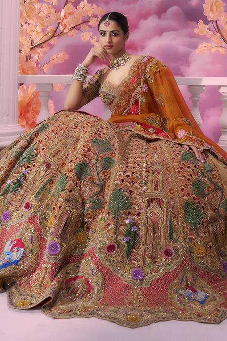 Orange bridal lehenga featuring zardozi, thread, dori & applique 3D embroidered palace motifs with multicolour bead-sequin embellishments. Paired with a padded embroidered blouse with scallop border sleeves and a color block scallop border 3D embroidered shoulder dupatta.