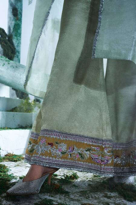 Mint green trench coat featuring intricate zari, dori, aari, zardozi, and horse applique embroidery. Paired with a padded corset top and flared pant in satin silk fabric.