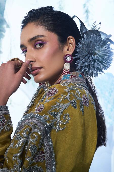 Mustard yellow anarkali featuring geometric applique, zari, dori, aari, and zardozi embroidery. Paired with a flared pant for a complete look.