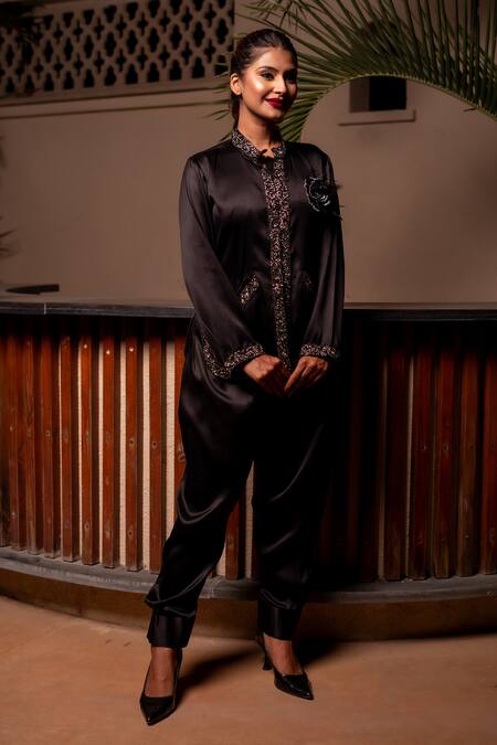 Black satin blend jacket featuring bead work on the placket, collar, and hem with thread embroidered rose in the front. Paired with a tulip pant that complements the jacket's design.
