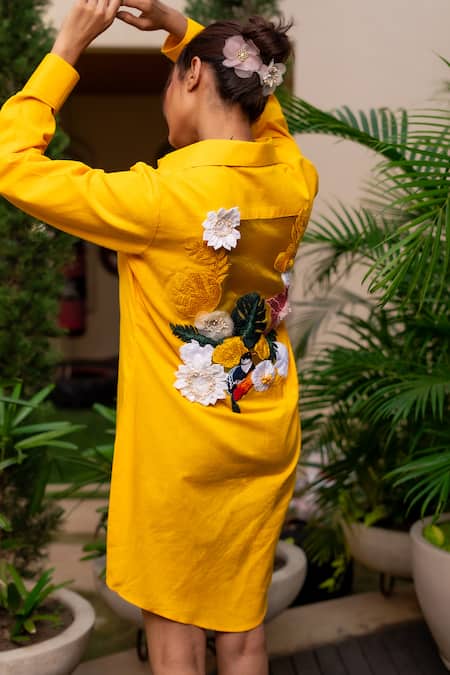 Yellow shirt dress featuring thread embroidered flower and bird motifs on the back and collar