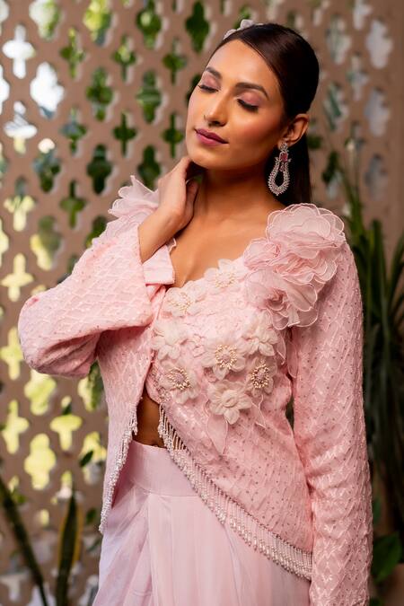 Baby pink jacket top featuring flower appliques, pearls, threads, and sequins embroidery. Paired with a plain draped skirt for a complete look.