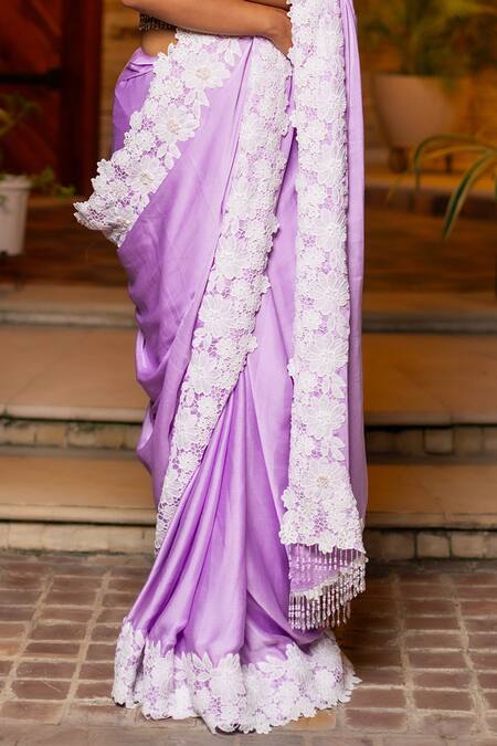 Purple embroidered saree featuring a lace detailed border and adorned with pearls. Paired with a padded crochet bustier embellished with embroidered fringes at the hemline and a matching petticoat.